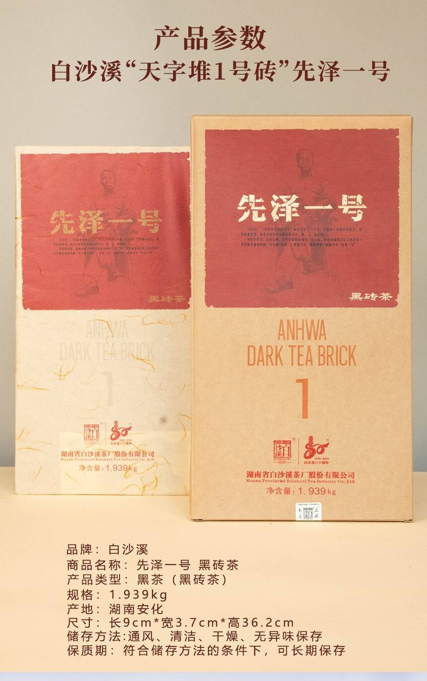 • 湖南安化正宗黑茶白沙溪獲磚先澤一號(hào)黑茶1.939kg盒